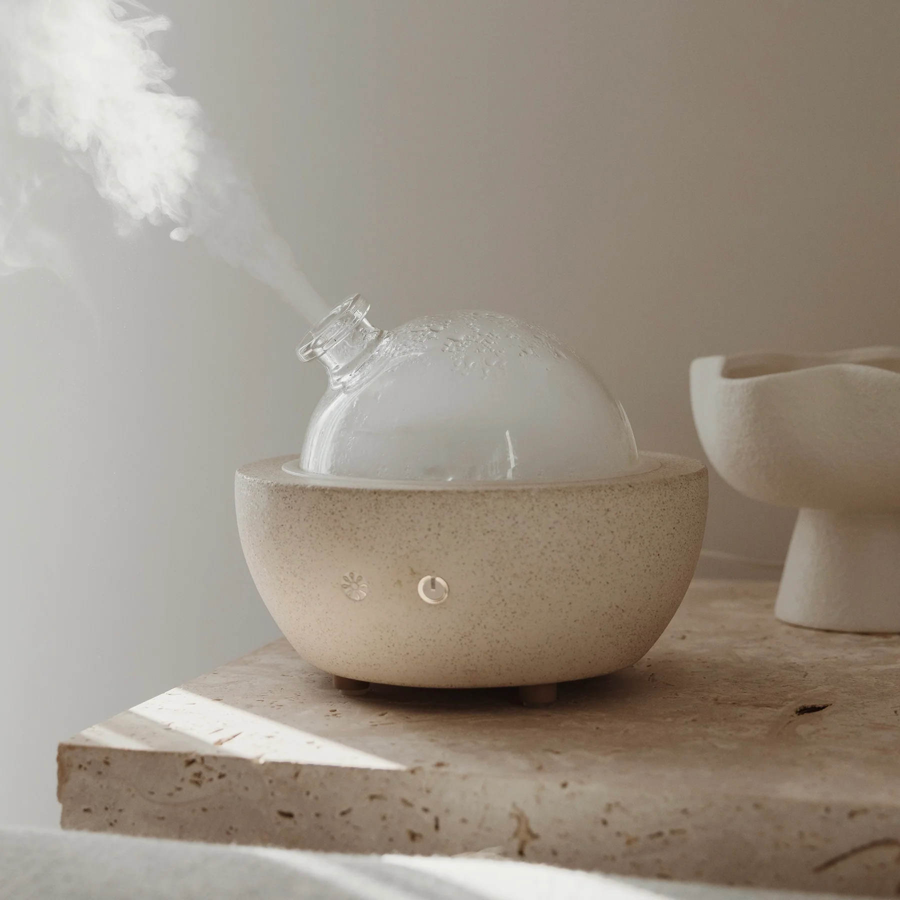 The Aurora Diffuser features a sophisticated design, combining the natural texture of cement with the clarity of glass. This timeless piece seamlessly integrates with any interior, adding a touch of elegance to your home.