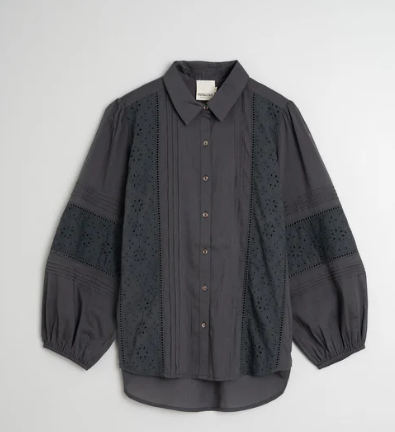 • Fitted shoulder with puffed sleeves and rubberized cuff. • Embroidered details with floral motifs cut out and worked with drawstrings and hemstitches on a cotton voile. • Relaxed Fit: Designed to feel slightly loose. • Measurements on size S in flat: Length from shoulder: 64cm. Chest width: 50cm. Bottom width: 56cm.